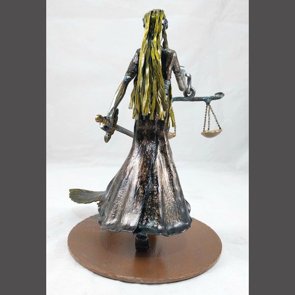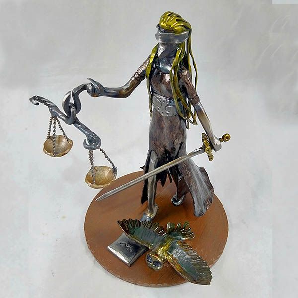 Dama de la justicia en hierro, acompañada del búho de la sabiduría. Un regalo personalizado para una abogada, que como me dijo la clienta: "es una excelente abogada y una bellísima persona", desde luego así debe de ser, no todo el mundo encarga un regalo de estas características. La dama de la justicia con los ojos tapados, pues la justicia es ciega, no ve si es rey o vasallo, juzga por igual y desde luego con la balanza equilibrada. En su mano izquierda una espada para mostrar su fuerza y su firmeza para no dejarse intimidar, también le he añadido el Búho de la sabiduría, pues para juzgar a personas hay que ser sabio y equilibrado y también lo he puesto en vuelo veloz para darle la velocidad que necesita la justicia, púes no podemos dejar pasar tanto tiempo en los juicios. Que importante la Justicia, junto a la sanidad y la educación publicas, para mí, el tercer pilar de un estado vasado en el bien común a los que habría que dar todos los medios para su correcto funcionamiento. Enhorabuena a la abogada, espero que le guste.